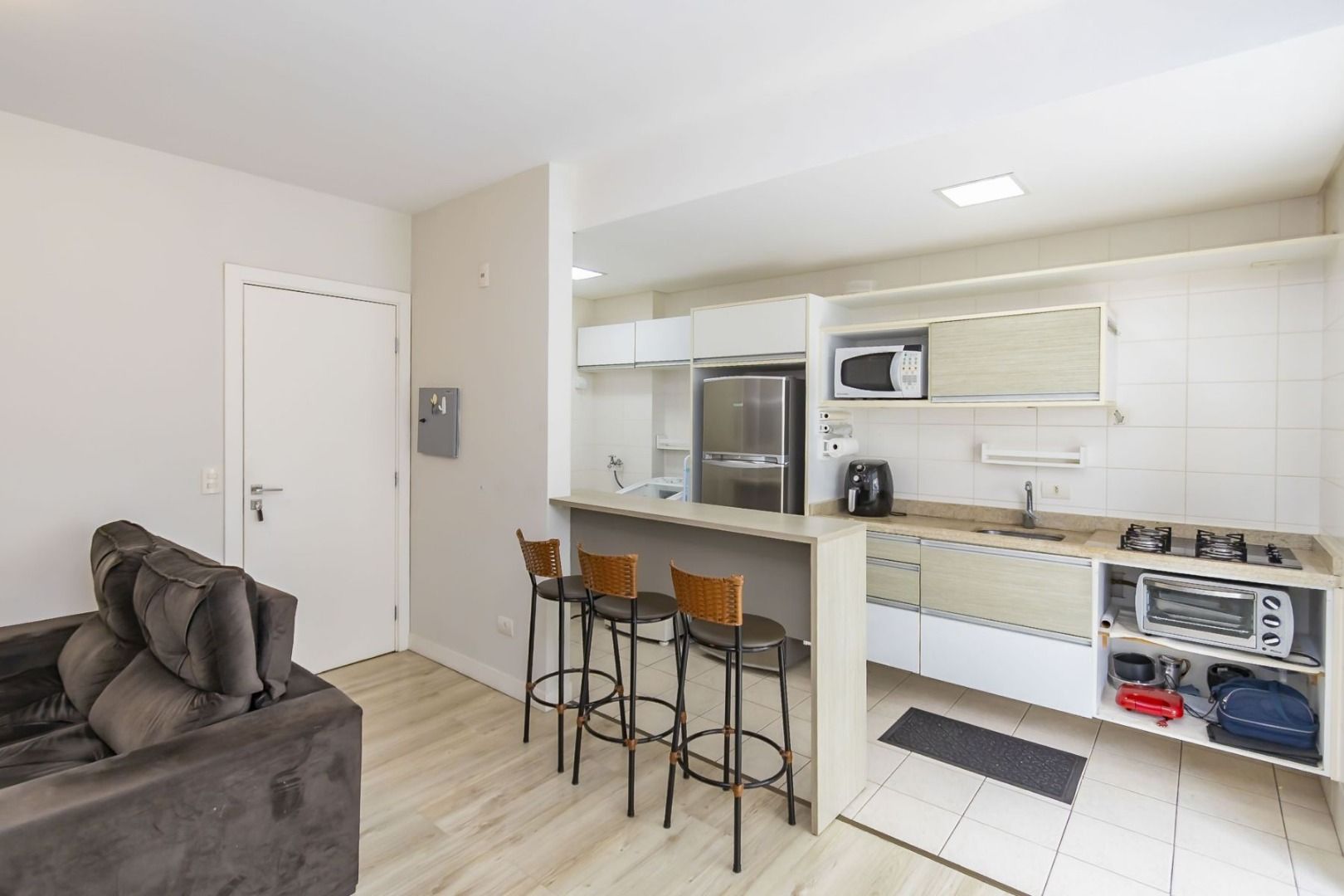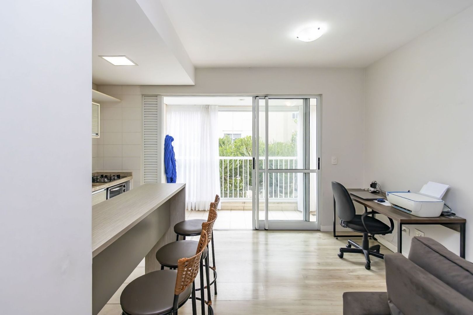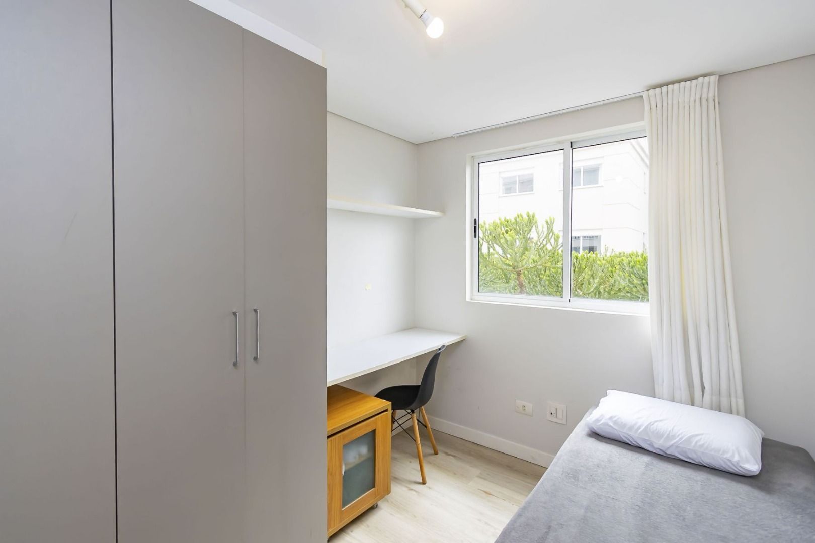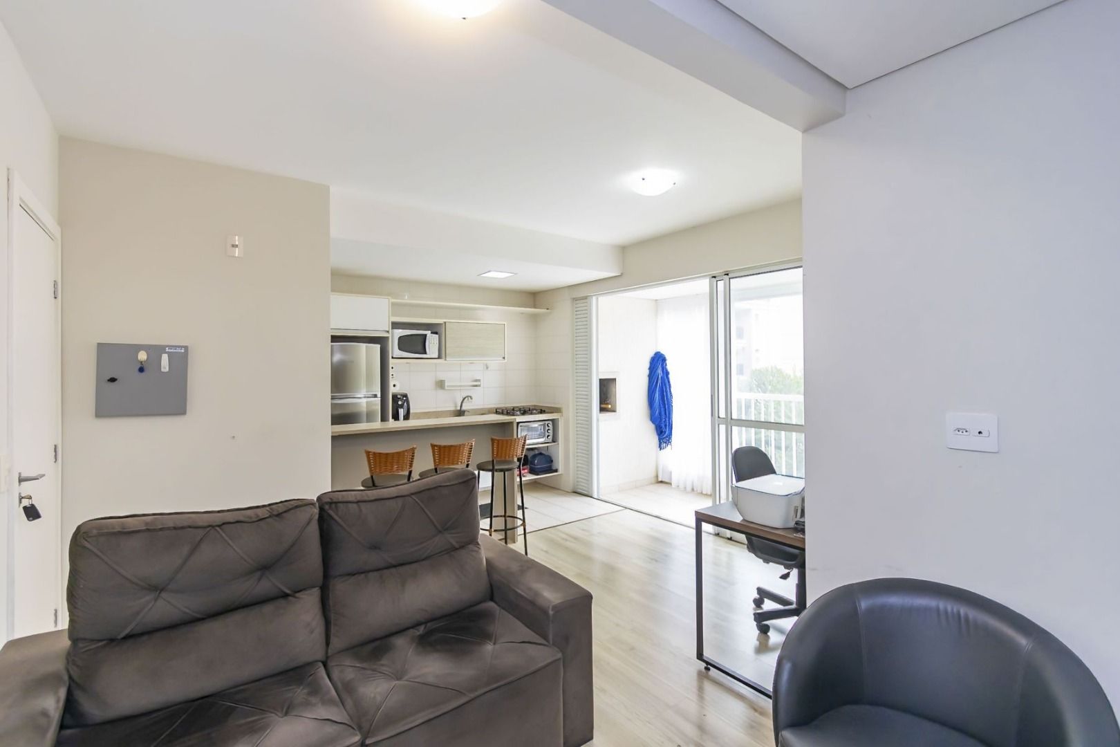 Apartamento semimobiliado no 5º andar, face oeste, com sala para dois ambientes, cozinha planejada equipada, sacada com churrasqueira, 2 quartos (1 suíte) com armários, banheiro social e 1 vaga de garagem individual.