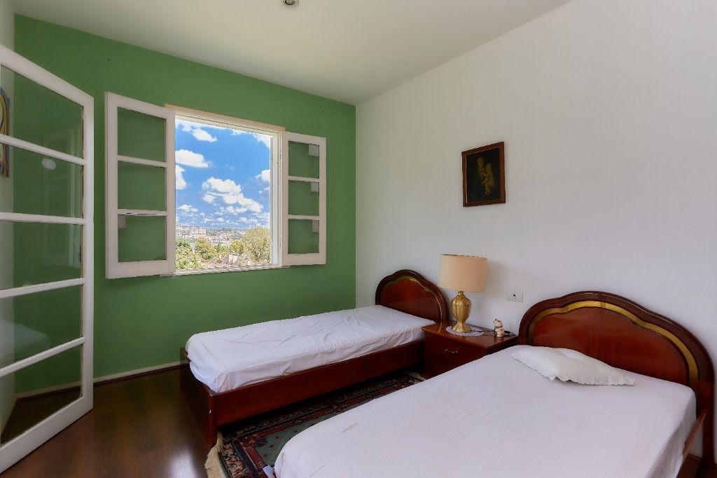 Piso Superior: Uma suíte master deslumbrante com lareira e vista panorâmica, além de dois dormitórios e uma sala de banho com banheira voltada para o verde do parque.
