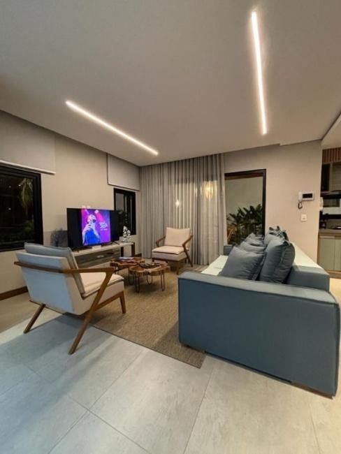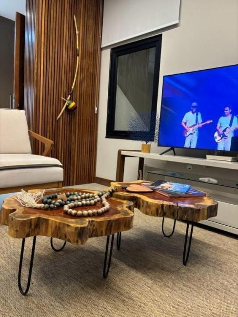 Sala com armários, painel de TV, mesas, cadeiras, sofá, televisão.
